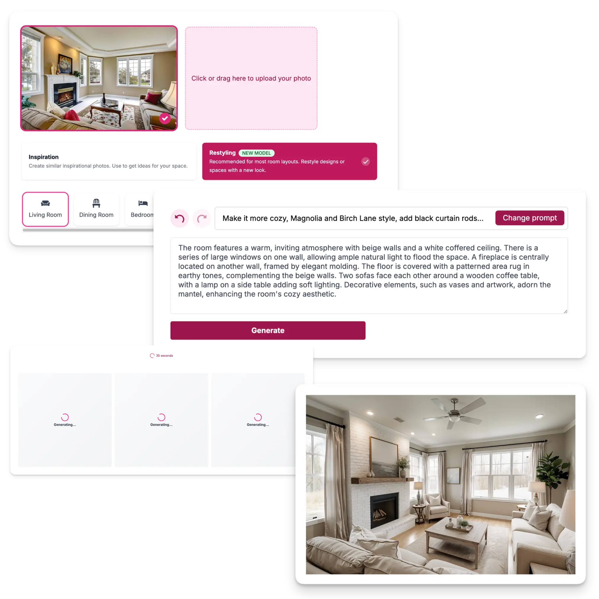 - Realistic Visualizations: Upload a photo of your room, and the AI instantly generates realistic design concepts tailored to your preferences.